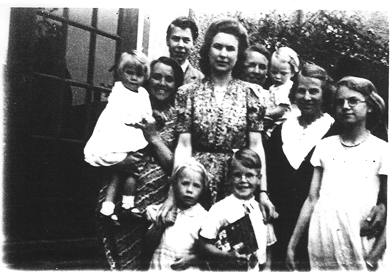 Gwen Gurney center; Janet Hatch and Malcom Stuart front; clockwise from btm left: Meg (Gurney) Hatch holding Sylvia, Roy Gurney, Vera (Gurney) Stuart holding Sandra, Rose (Horwood) Gurney, Edna Gurney c. 1943