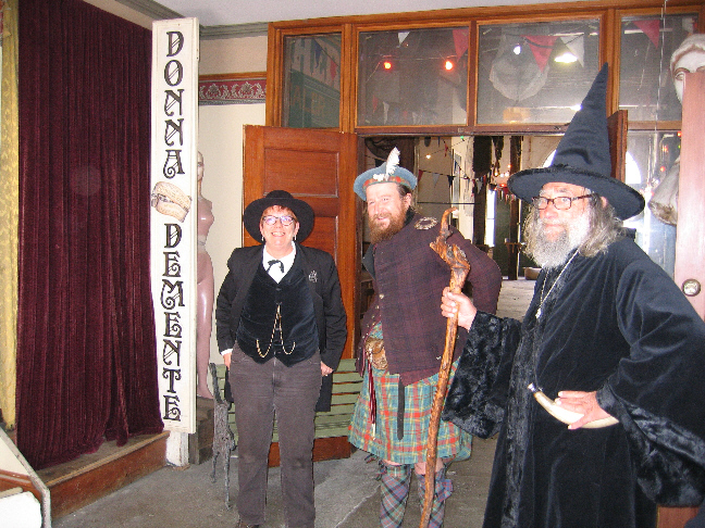 2. The Arch-Wizard of New Zealand QSM, Michael O'Brien (Bookbinder and 18th Century Scot), and Sue Leader, Goldsmith/Jeweller, await the final guests. (Photo by courtesy Yannick Servole, Photographer, Oamaru Mail) |