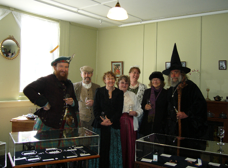 6. The Guests - those who provided much needed encouragement for the new venture - pose for Posterity! Left to right: Michael (Michael O'Brien Bookbinder), Mike (Tiger Lily's), Liz (Grace Crystals), June (Bead Emporium), Chantelle (Tiger Lily's), Marie (Michael O'Brien Bookbinder), The Arch-Wizard of New Zealand, QSM. Not pictured: Derek (Bead Emporium - came later as someone had to run the shop!) and Linda French (Best Mate, Wellington, present by cellphone - which can be sighted in Photo #4 - and in spirit.) |