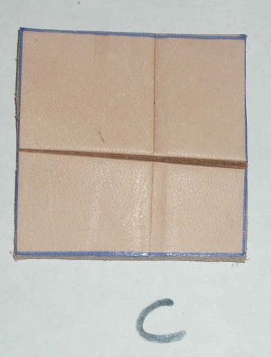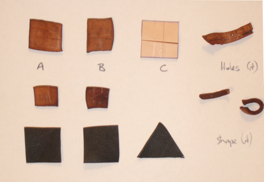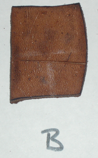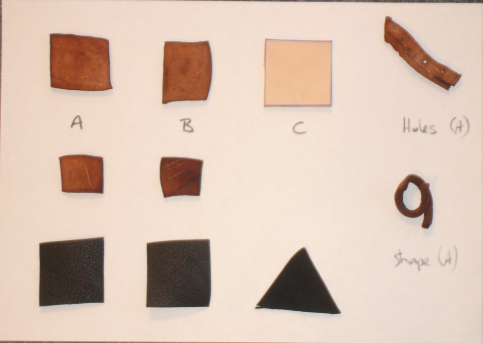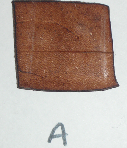 STRENGTH TEST The cuir bouillied materials were allowed to dry for several days. They were then hit with both the front (sharp) edge of a large meat cleaver and the back (blunt) edge of the cleaver - all full strength blows. The blunt edge of the cleaver shows as shiny lines in most cases, actual cuts are from the front edge. N.B. Chrome tanned not strength tested. PHOTO OF CLEAVER TO COME! |