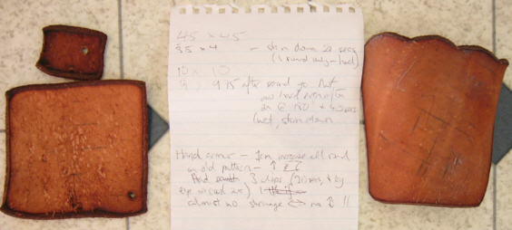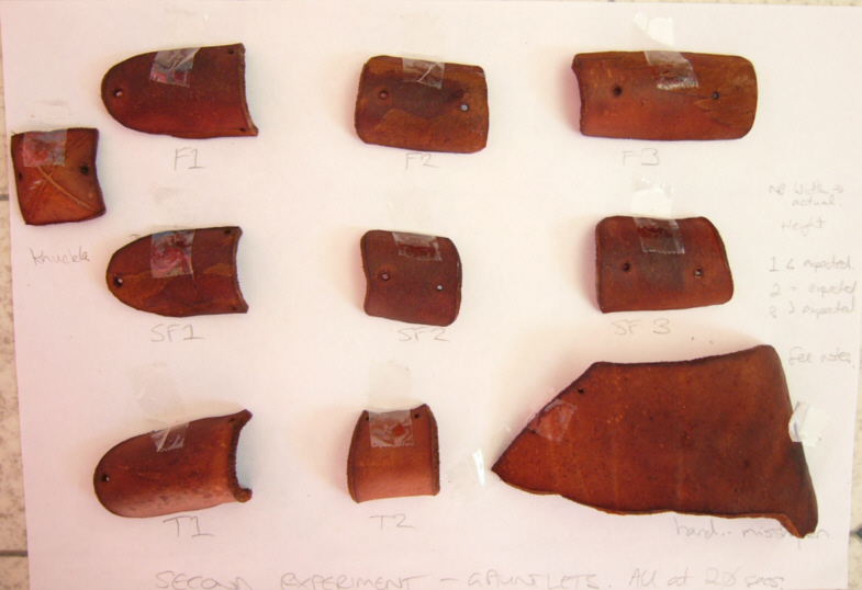 Fingered Gauntlets - Shrinkage outcomes The cuir bouilli outcomes were generally very good in terms of hardness achieved and lack of distortion. The exception was the back-of-hand piece which distorted almost unbelievably. Shrinkage rates were odd. (See Gauntlet Spreadsheeted Results below). |