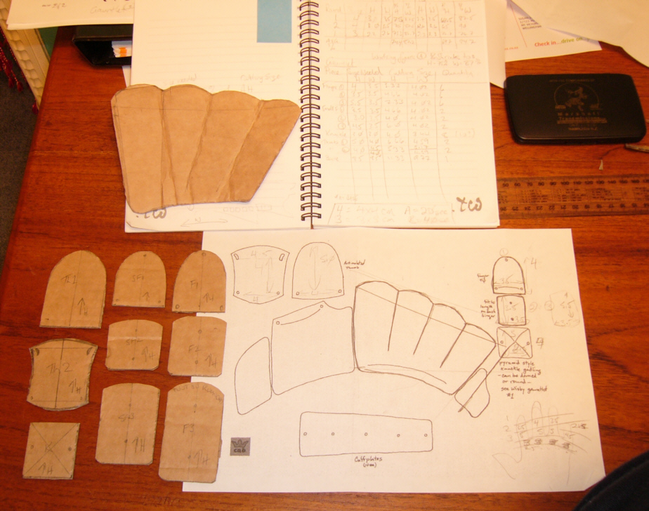 FINGERED GAUNTLETS The next step was to check out the shrinkage calculations on real pieces. I planned to build cuir bouilli Finger Gauntlets on the Wisby model. The pattern used is based on ones for steel gauntlets 2 . Pattern pieces were cut from cardboard based on the averaged shrinkage figures of height 75% and width 87% 3 . (For full cutting figures see Gauntlet Spreadsheeted Results below.) |