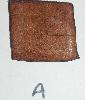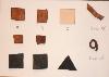 FIRST SHRINKAGE EXPERIMENT Rows: 1. Originally 4 cm x 4 cm bark-tanned leather (3 mm [7-8 oz] "russet") 2. Originally 2 cm x 2 cm bark-tanned leather (3 mm [7-8 oz] "russet") 3. Originally 4 cm x 4 cm chrome-tanned leather (1.2 mm [3 oz] dress leather) Columns: First column (A): 20 seconds in boiling water Second column (B): 40 seconds in boiling water "Holes": 40 seconds "Shape": 40 seconds |