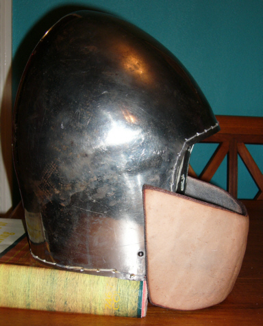 There is evidence for bascinets having an attached lower face-plate/early bevor. One illustration can be found in Ashdown1 . Given the cost of a full metal helmet, I decided to have a go at a cuir bouilli faceplate/bevor. |